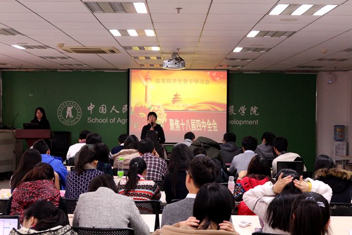 会议的第一阶段,与会同学一起学习十八届四中全会的会议精神与相关内容,并观看了大会视频。本科党支书杨梅同学还介绍了与农业农村领域相关的法治建设问题。