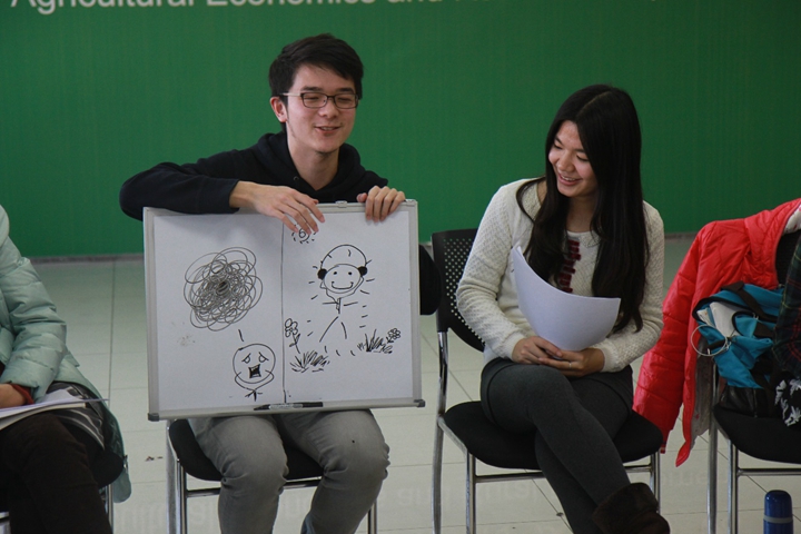 最后,大家画出自己高兴与不高兴时的状态并述说自己排解压力的方式。辅导员将大家的方式进行归类:自我处理和他人处理,并指出两种方式均能缓解压力,而每个人都应该依据自身情况选择最适合的方式。对于某些情况,转移注意力是只能够缓解情绪,直接面对妥善处理才是最终之计。
