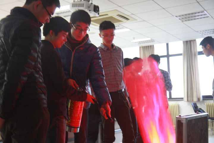 最重要的是,田老师从保卫处带来了灭火器和消防栓的训练模型,向同学们仔细演示了它们的使用方法和注意事项。听完讲解,同学们都跃跃欲试,现场的同学依次练习使用灭火器和消防栓。在实践的过程中,大家收获很大。