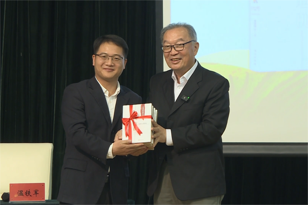 建系70周年/建院20周年院庆系庆老院长、老书记系列学术讲座第二讲在学校八百人大教室成功举办。讲座以“经济周期与‘三农’问题”为主题,由学院原院长温铁军教授主讲。学院党委书记曾丙健主持讲座,并代表学院接受温铁军教授赠送的《八次危机》(100万册纪念版)。