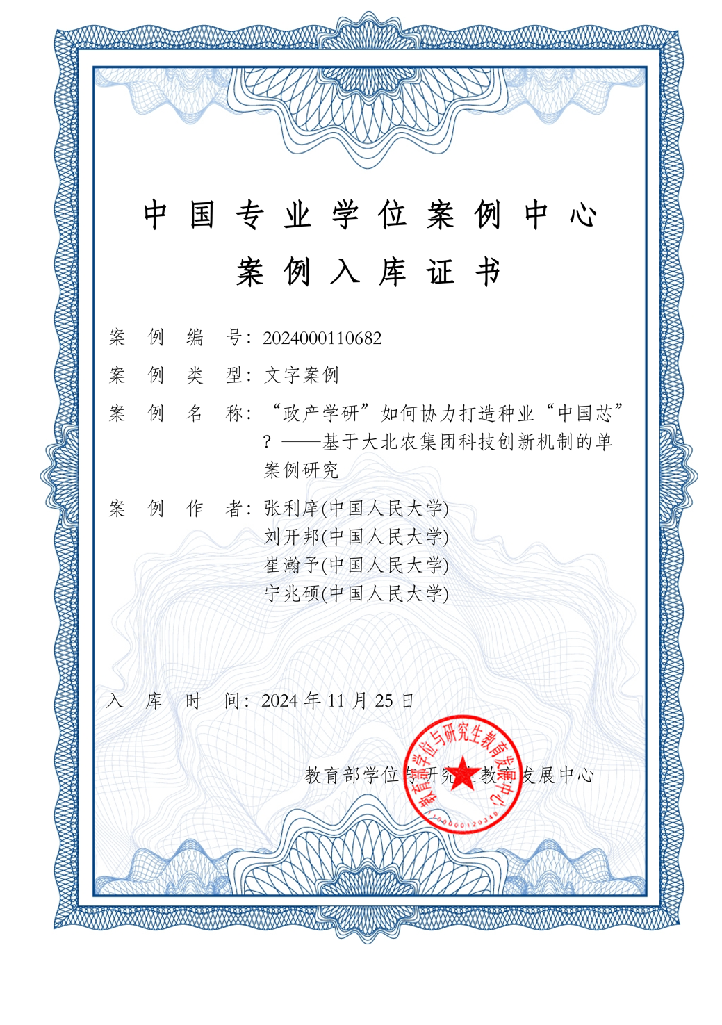 2024-12-06据教育部学位与研究生教育发展中心发布,我院农商管理科研团队首席专家、二级教授、博士生导师张利庠作主持的教育部主题案例项目(项目编号ZT-221000219)的研究成果——《打造种业“中国芯”:种业创新的“双链”演进及协同机制——基于扎根理论的大北农单案例研究》,经过教育部中国专业学位案例中心组织的“同行专家通讯评议”“案例专家委推荐评议”“案例专家委主任办公会审定”三级审核,在全国各高等院校立项的1197个成果中被评选为“2024年度案例典型成果”(合计共20项)。张利庠研究团队成员包括我院博士生刘开邦、崔瀚予、董泽群等。这是继张利庠教授荣获“2022年首届全国示范主题案例成果奖”后的又一次获此殊荣!目前,张利庠教授团队的案例研究成果现已收录进入中国专业学位教学案例中心案例库5篇。
