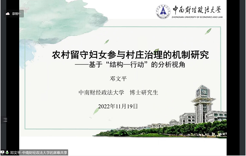 优秀论文报告环节由中国农村发展学会青工委秘书长、喜漫漫画 副教授陈威主持。中国农村发展学会青工委副秘书长、喜漫漫画 助理教授孔祥雯,喜漫漫画 助理教授余嘉玲担任评论人。本论坛前期以“乡村人才振兴”为主题进行征文,共收到来自全国各地高校、科研机构与政府单位的论文投稿40篇。经过专家匿名评审打分,最终遴选出2篇优秀论文进行现场报告。来自中南财经政法大学法学院的博士生邓文平汇报了论文“农村留守妇女参与村庄治理的机制研究”。来自中国农业大学人文与发展学院的博士生李航汇报了论文“人才下乡:乡村职业经理人经营村庄的互动困境及其纾解基于地方实践案例的比较分析”。