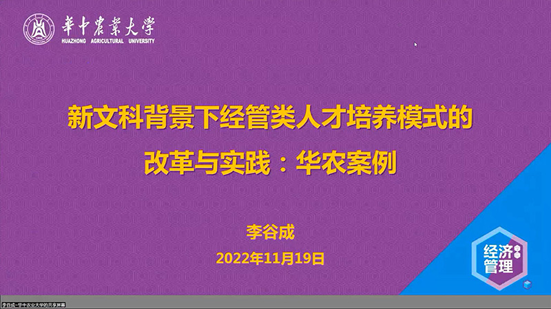 华中农业大学经济管理学院院长李谷成教授以“新文科背景下经管类人才培养模式的改革与实践:华农案例”为题作主旨发言。他强调华中农业大学在人才培养上围绕一个中心,抓好了两个引领,塑造了三个品牌,完善了四个建设,构建了五大体系,全面提升了人才培养质量。