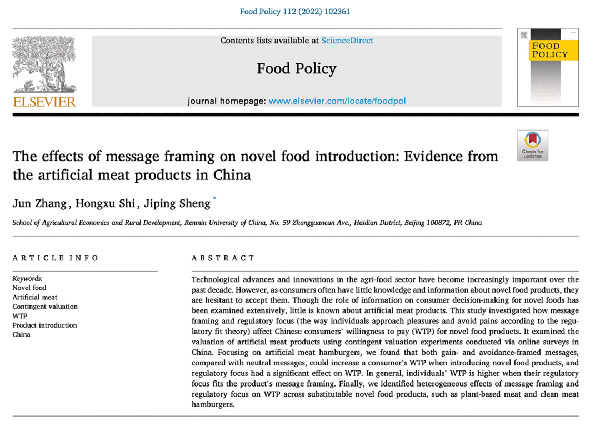近日,我院师生在农业经济领域国际著名学术期刊《Food Policy》发表题为“The effects of message framing on novel food introduction: Evidence from the artificial meat products in China”的文章(论文链接://doi.org/10.1016/j.foodpol.2022.102361)。该研究是我院张君副教授、博士生石鸿旭以及生吉萍教授的共同成果。这项研究旨在探究信息框架和聚焦调节对消费者购买新型食品支付意愿的影响。